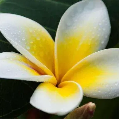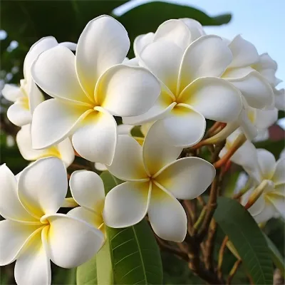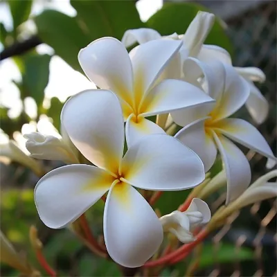 Frangipani is a deciduous shrub or small tree of the family Oleanderaceae, Frangipaniaceae. The branches are stout and fleshy, the leaves are thick and papery, the midrib is concave on the leaf surface, and the lateral veins are flattened on both sides. The inflorescence is apical, the peduncle is trifid, fleshy, the peduncle is pale red, the calyx lobes are small, ovate, the corolla is white on the outside, the outside of the corolla tube and the left side of the lobes are slightly reddish markings, the inner surface of the corolla is yellow, the corolla lobes are broadly obovate, the apex is rounded, the base is covered to the left, the stamens are borne at the base of the corolla tube, the filaments are very short, and the anthers are oblong. Follicles twin, broadly ambiguous, cylindrical, tapering toward the apex, seeds obliquely oblong, flattened, apex with membranous wings. The flowering period is from May to October, and the fruiting period is rarely cultivated, generally from July to December.