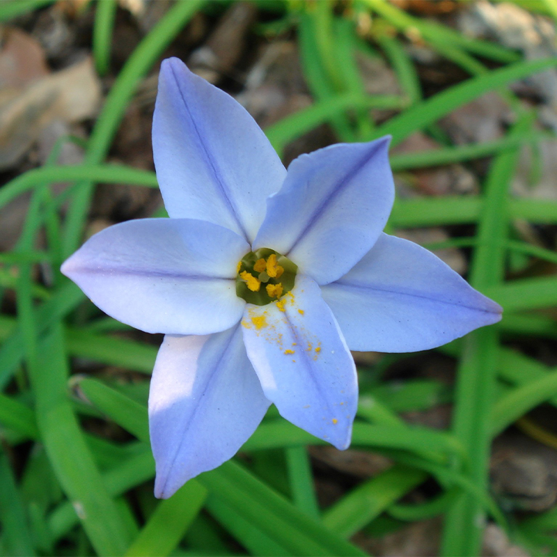 Ipheion uniflorum, commonly known as Spring Starflower or Spring Star, is a charming perennial bulb appreciated for its delicate beauty and early spring blooms. This plant species features slender, grass-like foliage that emerges from small bulbs, forming neat clumps. The foliage serves as an attractive backdrop for the star-shaped flowers that appear in clusters atop slender stems.