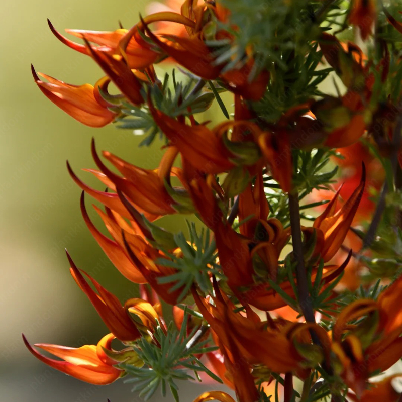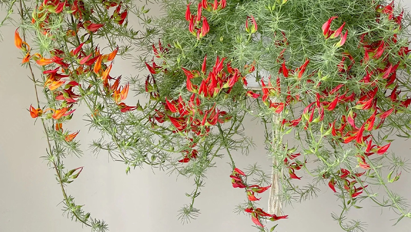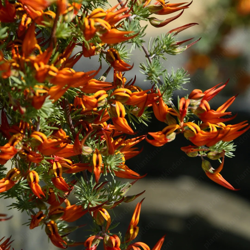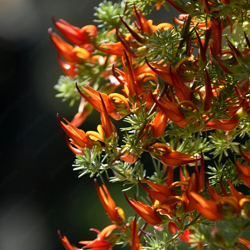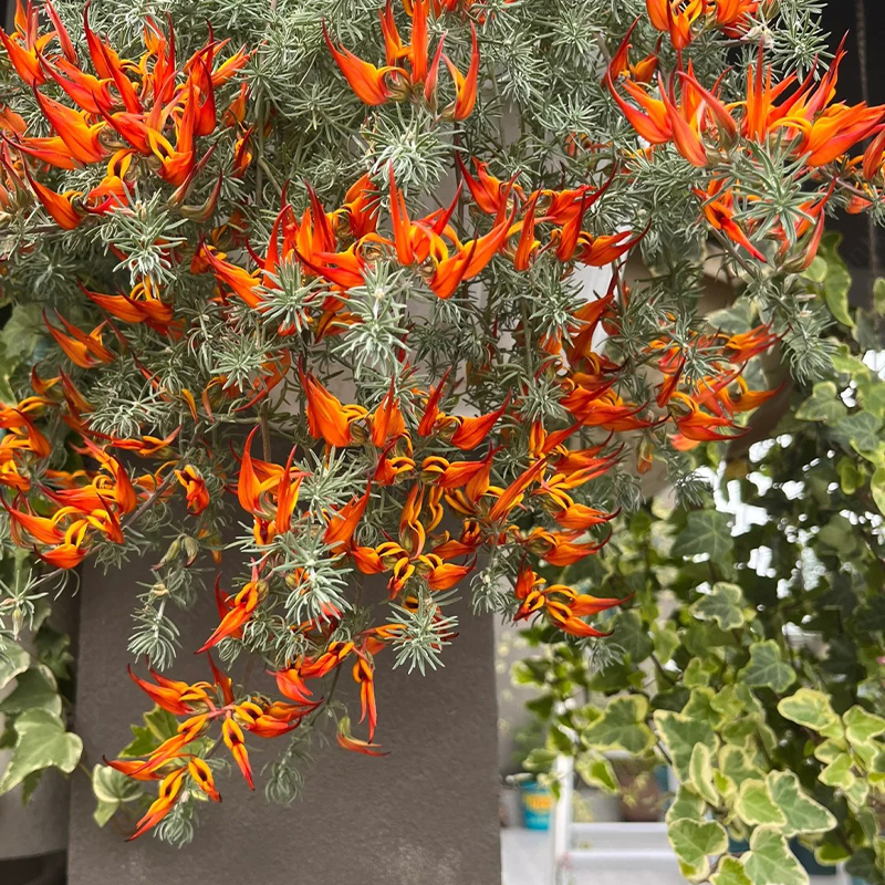 Lotus berthelotii is a trailing, perennial plant characterized by its delicate, silver-gray, needle-like foliage and vibrant, beak-shaped flowers. The flowers, which bloom from late spring to early summer, are usually a bright red or orange-red color, resembling the beak of a parrot, hence the common name "Parrot's Beak." The plant’s trailing habit makes it ideal for hanging baskets, rock gardens, or as ground cover.