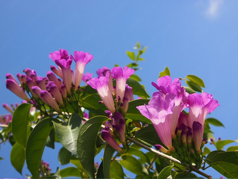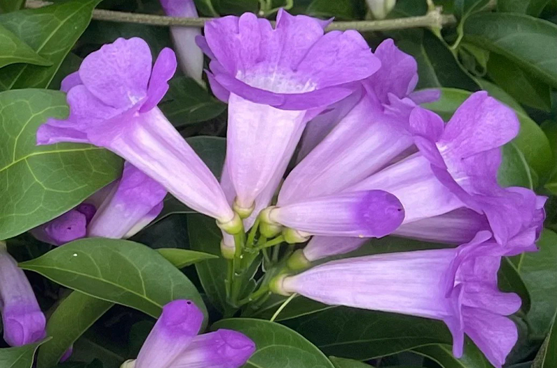Mansoa alliacea, commonly known as the Garlic Vine, is a robust and perennial climbing plant known for its striking flowers and garlic-like aroma emitted from its leaves when crushed.