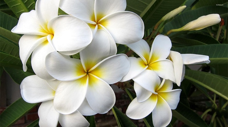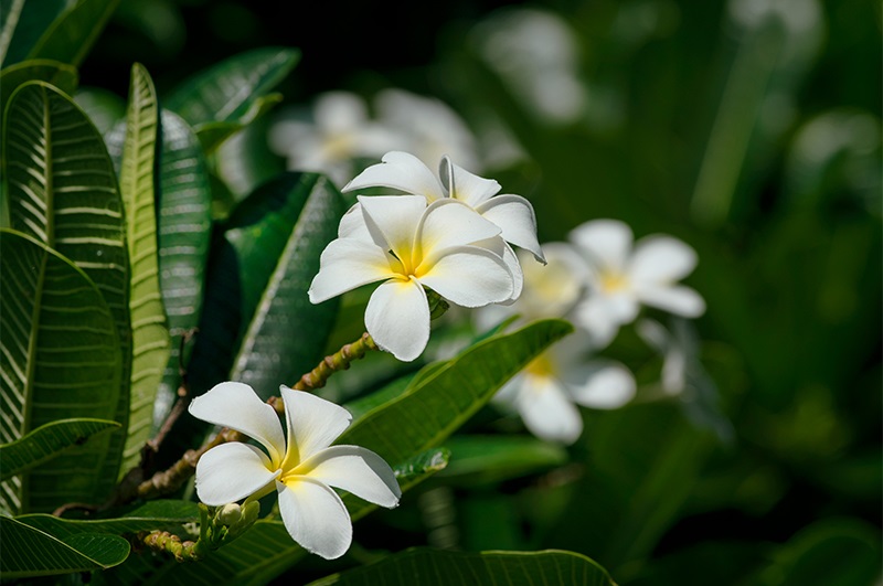 Plumeria is highly fragrant and blooms freely from spring throughout fall in multiple colors like white, yellow, pink, and red. These flowers stand out nicely amid the large-leaved foliage, which may be evergreen or deciduous, depending on the type.