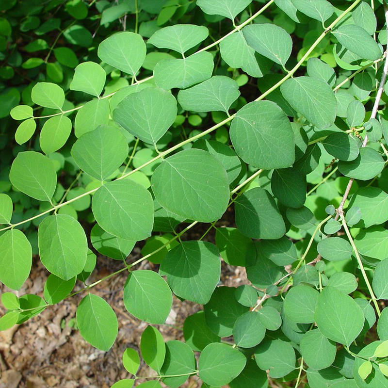 Symphoricarpos albus, commonly known as Snowberry, is a deciduous shrub valued for its ornamental berries and graceful form. This plant species features arching branches adorned with small, ovate leaves that are a soft green color during the growing season and turn yellow in the fall. However, it is the clusters of small, round berries that adorn the branches in late summer and fall that are the most distinctive feature of Snowberry. These berries start out white and gradually turn shades of pink or pale purple as they ripen, creating a beautiful contrast against the foliage.